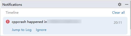 当设备抛出FaultLog日志时,DevEco Studio将会弹出消息提示框,开发者点击Jump to Log即可跳转至FaultLog窗口查看日志信息。