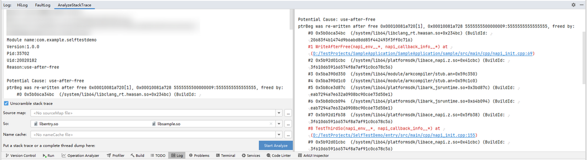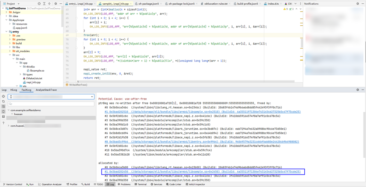 当程序出现内存错误时,弹出HWASan log信息,点击信息中的链接即可跳转至引起内存错误的代码处。日志中各字段的说明请参考HWASan日志规格,异常检测类型请参考HWASan异常检测类型。