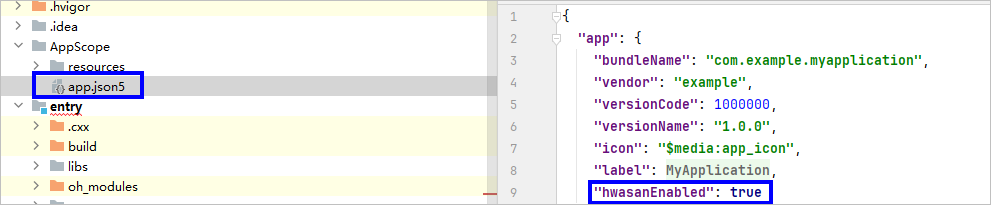 修改工程目录下的AppScope/app.json5文件,添加HWASan配置开关。