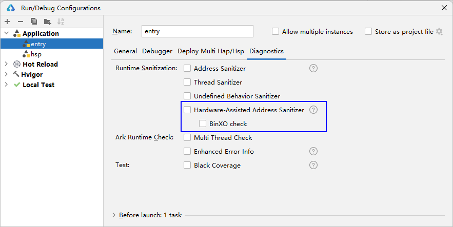 点击Run > Edit Configurations > Diagnostics,勾选Hardware-Assisted Address Sanitizer开启C++源码检测插桩。