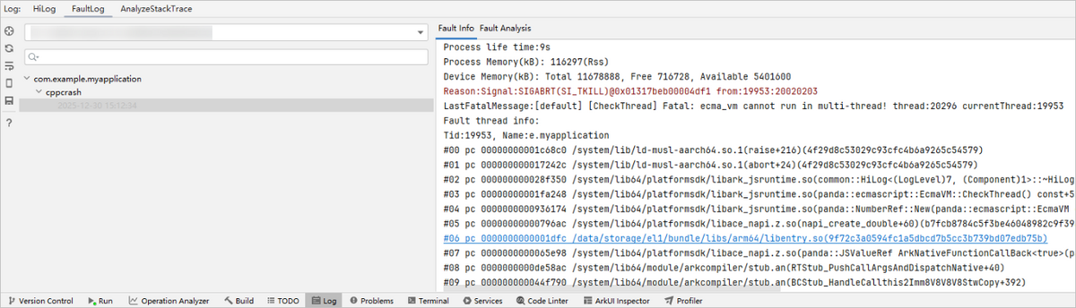 当程序出现多线程安全问题时,会弹出Crash log信息,点击信息中的链接即可跳转至引起多线程安全问题的代码处。关于多线程安全问题的分析方法请参考使用Node-API接口产生的异常日志/崩溃分析。