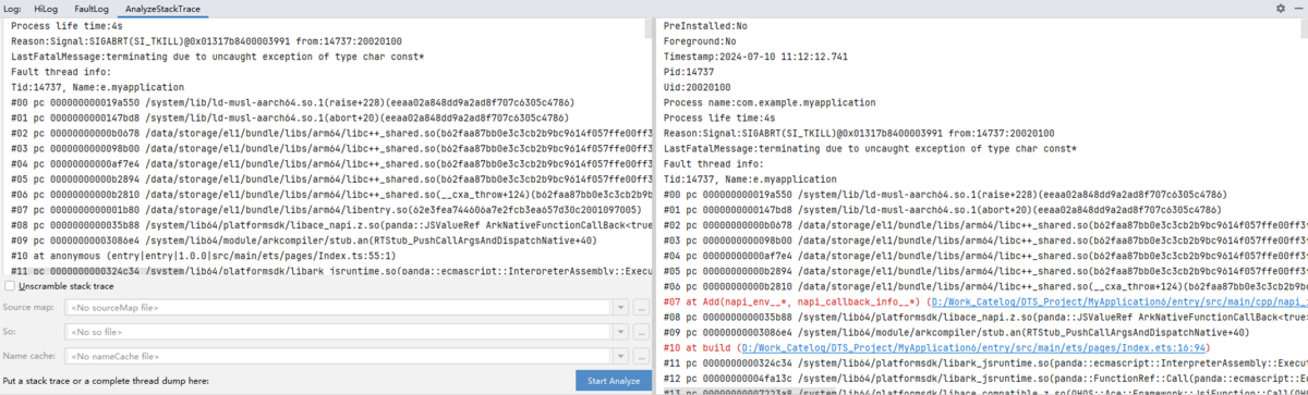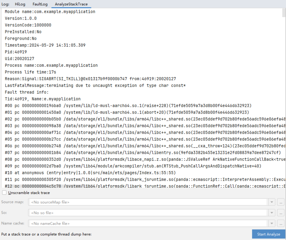 如果当前工程不是堆栈所在应用对应的工程,则需要配置应用对应构建产物:勾选Unscramble stack trace, 在下方的文件选择框中,分别添加应用对应的sourceMap文件、so文件以及nameCache文件,点击Start Analyze进行转换。