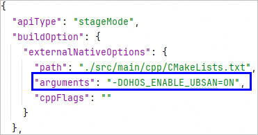 在需要开启UBSan的模块中,通过添加构建参数开启UBSan检测插桩,在对应模块的模块级build-profile.json5中添加命令参数: