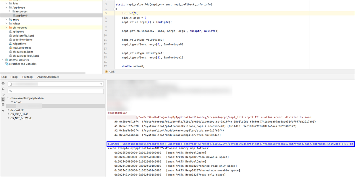当检测出未定义行为时,弹出UBSan log信息,点击信息中的链接即可跳转到未定义行为的代码处。日志中的异常检测类型请参考UBSan异常检测类型。