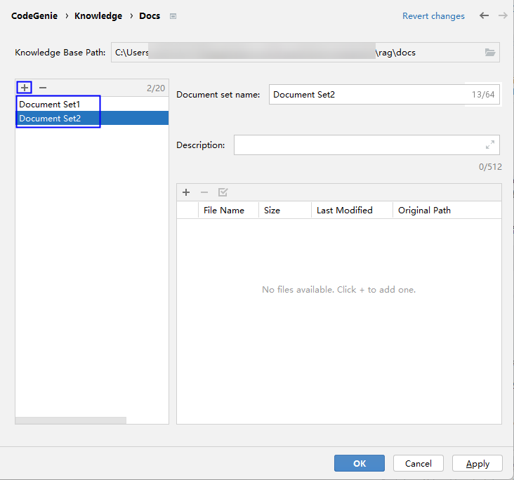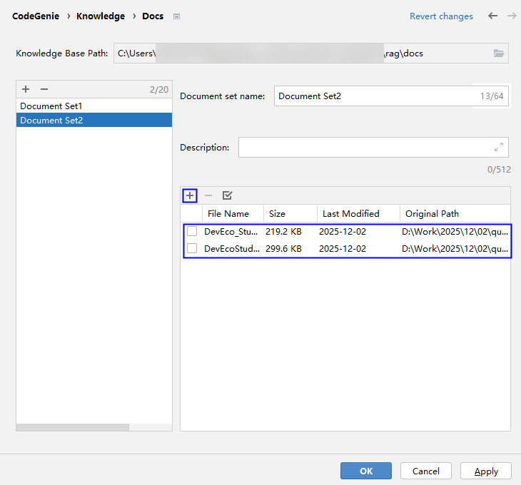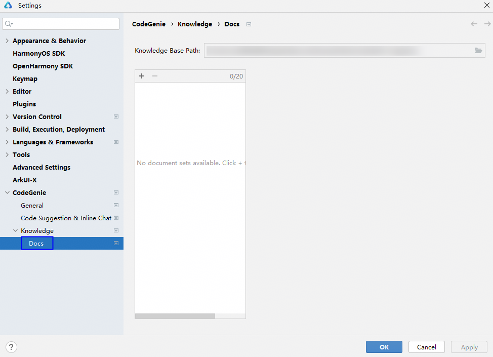 点击File > Settings(macOS为DevEco Studio > Preferences/Settings) > CodeGenie****> Knowledge >**** Docs,或在DevEco Studio右侧边栏点击CodeGenie(或输入快捷键Alt/Option+U) > ****@****Add Context > Docs > Set Local Knowledge Base,进入配置页面。