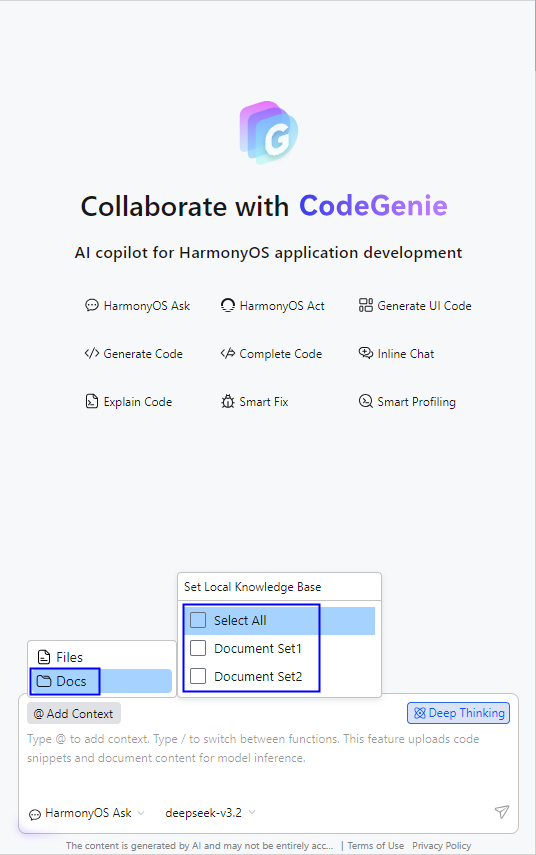 从DevEco Studio 6.0.0 Beta5开始,CodeGenie允许用户导入设计文档和代码等文件形成文档集,多个文档集组合成本地知识库。智能问答时,根据用户输入内容检索本地知识库以提升AI生成的能力。