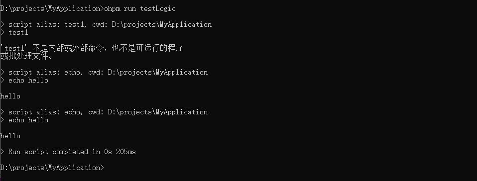 在解析脚本内容出错时,ohpm run命令将直接提示相应错误。比如,脚本内容中引用了一个在同一oh-package.json5文件中不存在的脚本别名;或在执行ohpm run时,发现脚本别名引用关系存在环的情况。