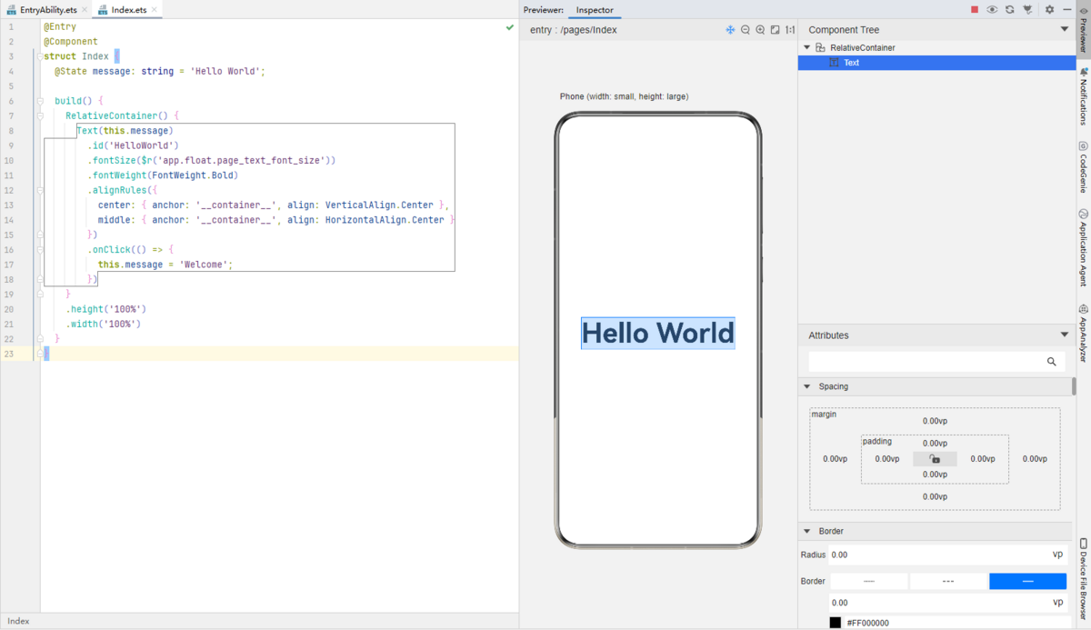 在预览界面还可以通过组件的属性面板修改可修改的属性或样式,在预览界面修改后,预览器会自动同步到代码编辑器中修改源码,并实时的刷新UI界面;同样的,如果在代码编辑器中修改源码,也会实时刷新UI界面,并更新组件树信息及组件属性。