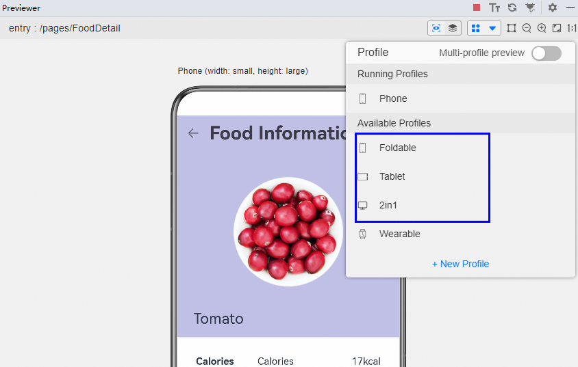 定义设备后,可以在Previewer右上角,单击按钮,打开Profile管理器,切换预览设备。