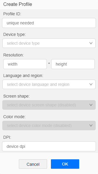 在Create Profile界面,填写新增设备的信息,如Profile ID(设备型号)、Device type(设备类型)、Resolution(分辨率)和Language and region(语言和区域)等。其中Device type只能选择module.json5中deviceTypes字段已定义的设备。