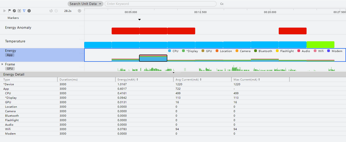 点击Energy泳道,可在下方数据区查看录制范围内具体器件消耗的电量,器件包含:CPU、*Display(屏幕显示耗电量)、GPU、Location(定位模块耗电量)、Camera(相机耗电量)、Bluetooth(蓝牙功能耗电量)、Flashlight(闪光灯功能耗电量)、Audio(声音模块耗电量)、Wifi(无线功能耗电量)、Modem(信号模块耗电量)。*Device表示整机电流消耗情况。