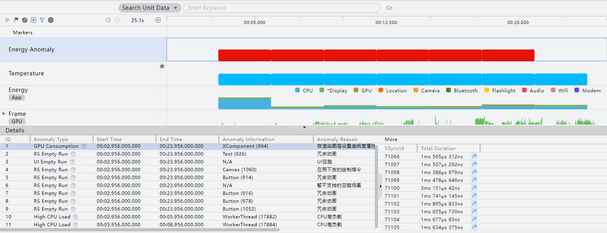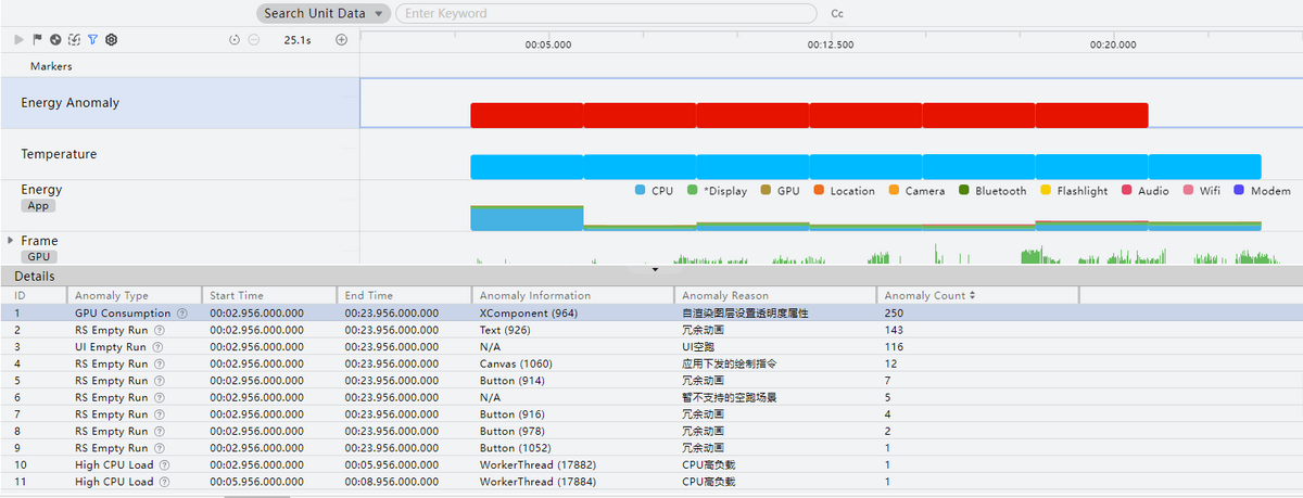 - Energy Anomaly泳道:展示能耗相关的异常帧信息。该泳道暂不支持在Wearable设备上进行应用性能分析;