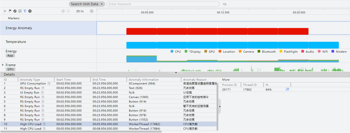 点击Energy Anomaly泳道,鼠标悬浮于泳道上,可以查看空跑的渲染帧数(RS Empty Run)、不能正常调用动态系统合成器(DSS)合成而直接使用GPU进行渲染导致能耗恶化的帧的次数(GPU Consumption)、UI空跑次数(UI Empty Run)以及CPU高负载异常次数(High CPU Load)。观察下方Details区域,可以看到所选范围内的能耗异常详情,包括能耗异常类型、开始时间、结束时间、能耗异常信息、能耗异常原因、能耗异常数量。