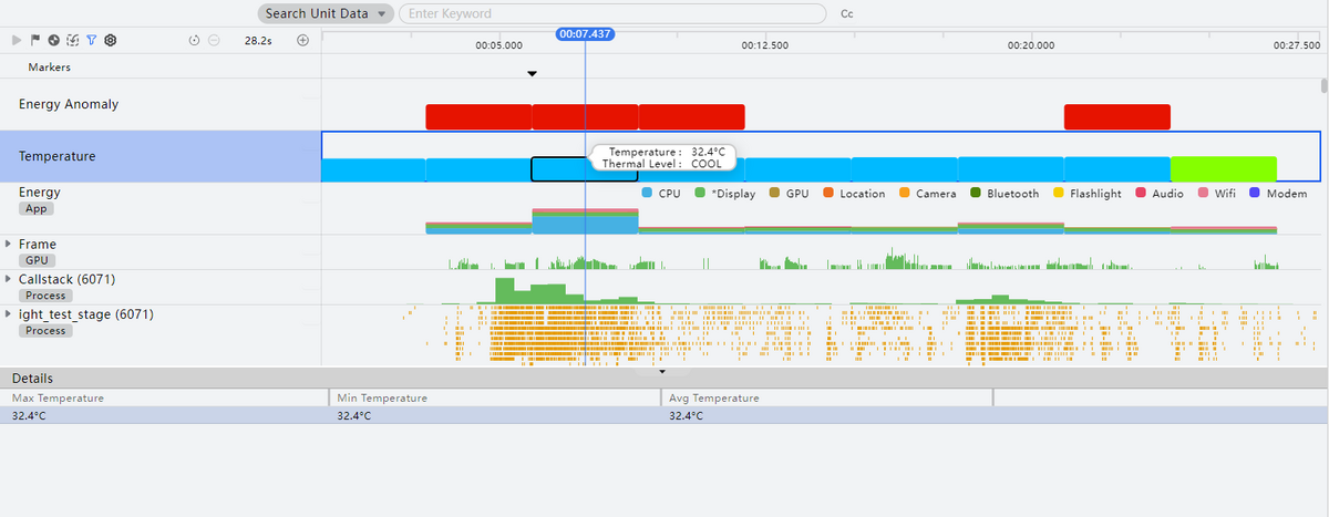 录制结束等待处理数据完成。默认包含Energy Anomaly、Temperature以及Energy三条能耗相关泳道: