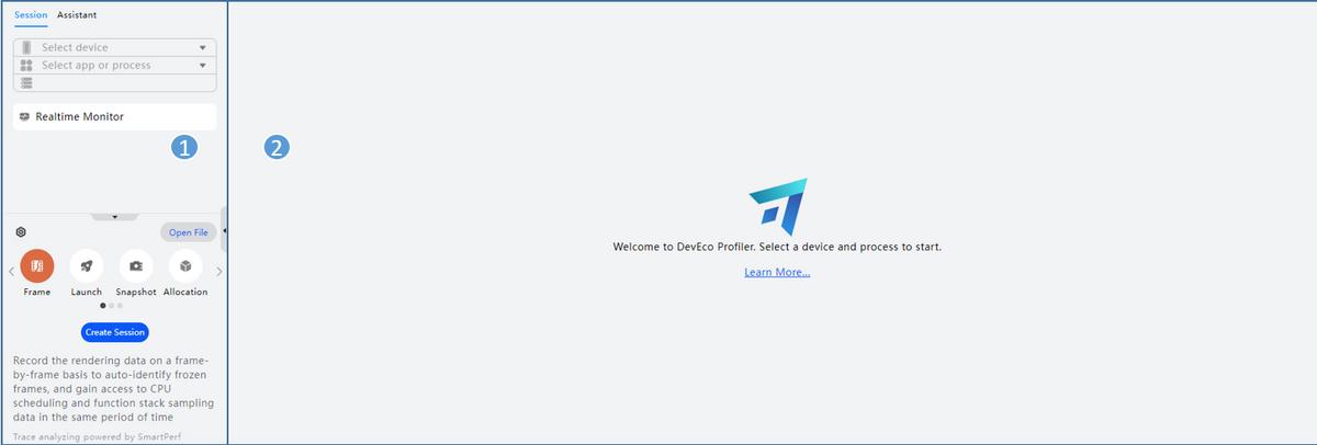 ①会话区:负责调优会话的管理。会话区提供了性能实时监控工具Realtime Monitor来帮助开发者先明确问题场景,完成问题的发现和初步定界。开发者可以在会话区选择待调优的设备、应用及当前应用进程,当前已创建的调优分析任务将在下方以列表的形式展示。