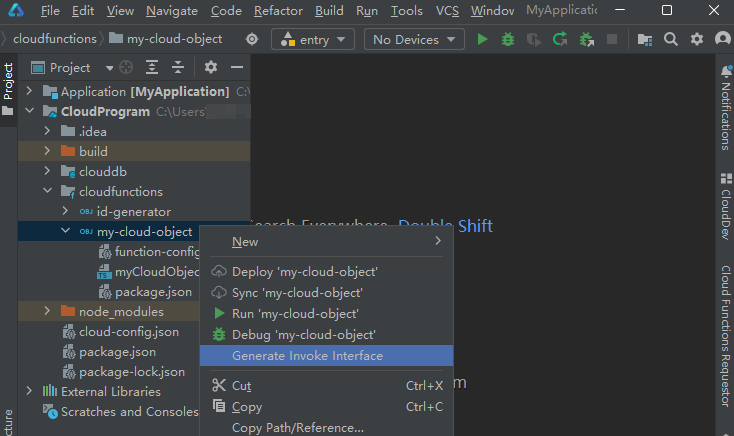 右击云对象(以“my-cloud-object”为例),选择“Generate Invoke Interface”。