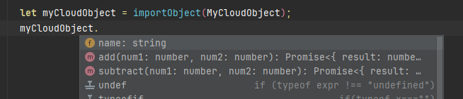 let myCloudObject = importObject(MyCloudObject); // 使用importObject实例化MyCloudObject的代理myCloudObject.add(1, 2).then(addResult => {console.log(`1 + 2 = ${addResult.result}`);}); // 忽略异常处理myCloudObject.subtract(6, 3).then(subtractResult => {console.log(`6 - 3 = ${subtractResult.result}`);});由于“Generate Invoke Interface”时已经生成所需要的模型以及importObject方法,因此在编码时可以很方便地使用联想、自动引入等DevEco Studio提供的高阶能力,如下图所示。