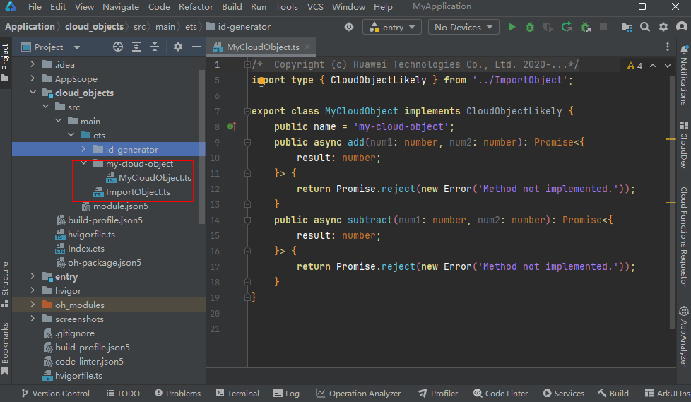 DevEco Studio自动打开指定的端侧调用接口类存储目录,该目录包含“ImportObject.ts”文件和“my-cloud-object”文件夹。