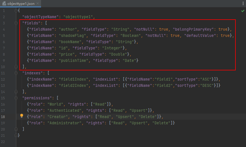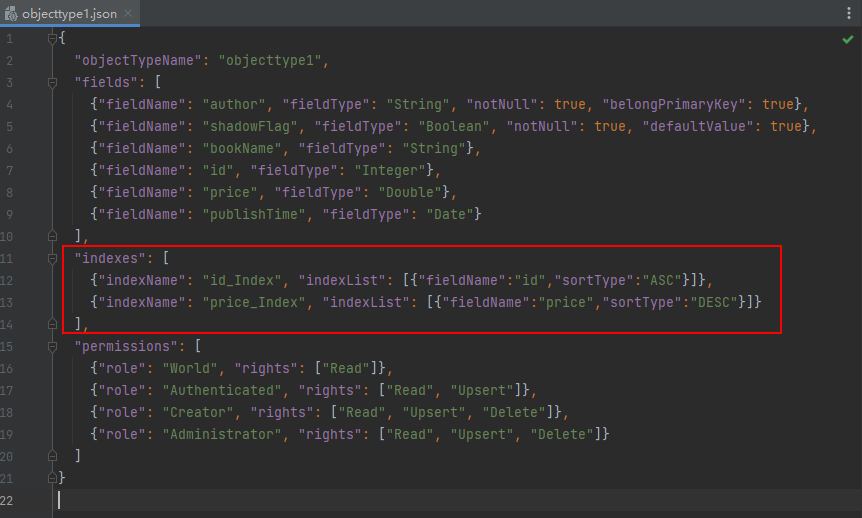 在“indexes”中为该对象类型配置索引、索引包含的字段、以及索引包含的字段的排序方式。
