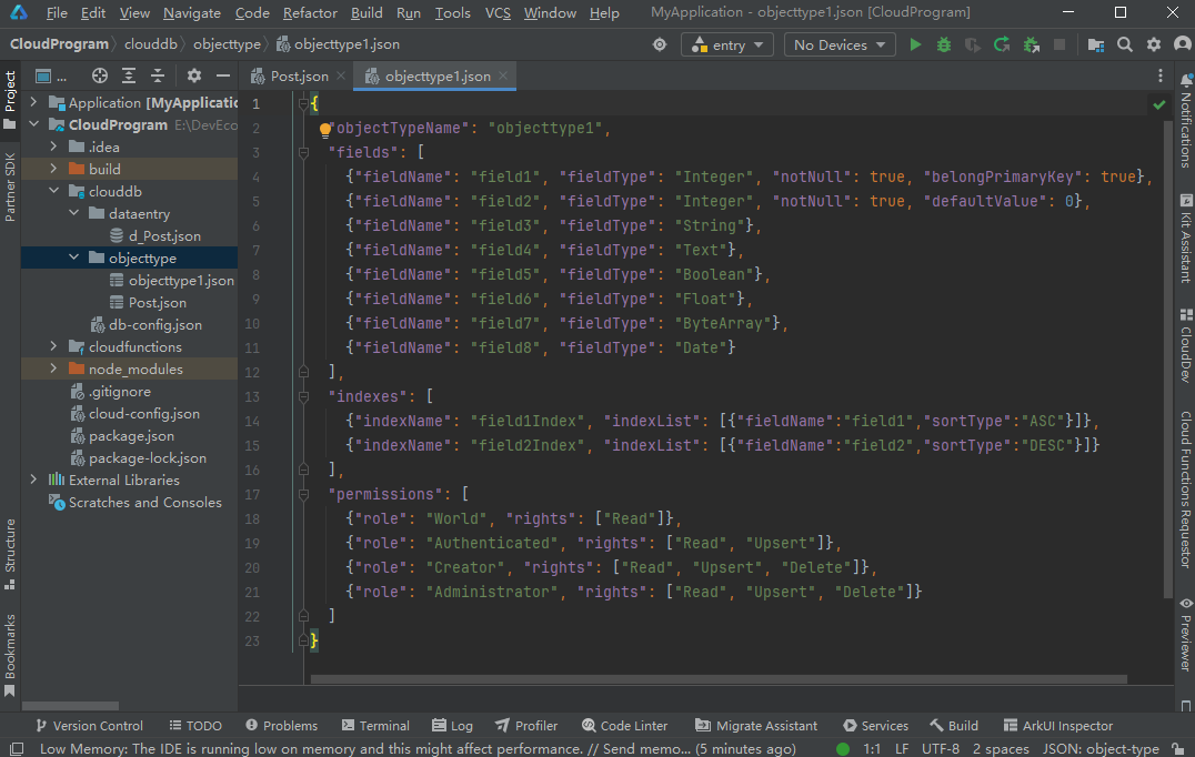 “clouddb/objecttype”目录下生成并打开新建的对象类型JSON文件“objecttype1.json”。