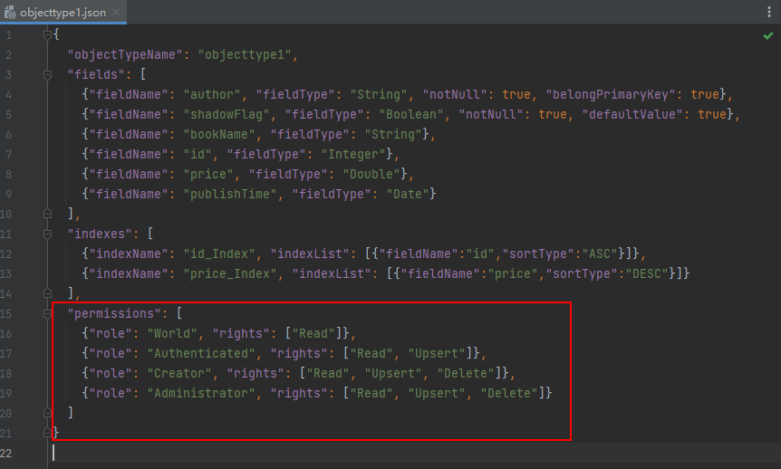 在“permissions”中设置各角色是否具有该对象类型的Read、Upsert(包含新增和修改)和Delete权限。