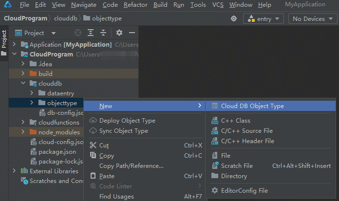 右击“clouddb/objecttype”目录,选择“New > Cloud DB Object Type”。