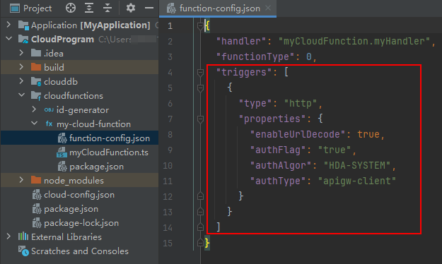 函数创建完毕后,您可在配置文件“function-config.json”的“triggers”下配置触发器,通过触发器暴露的触发条件来实现函数调用。