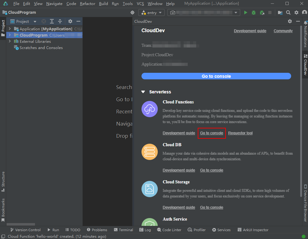 在打开的CloudDev面板中,点击“Serverless > Cloud Functions”下的“Go to console”,进入当前项目的云函数服务页面。