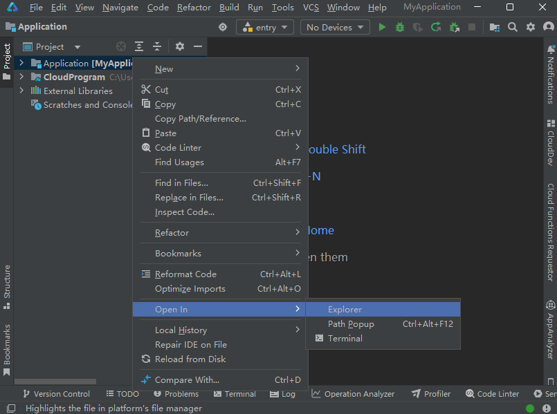 打开创建的端云一体化开发工程,右击端开发工程“Application”,选择“Open In > Explorer”,打开工程文件所在的目录。