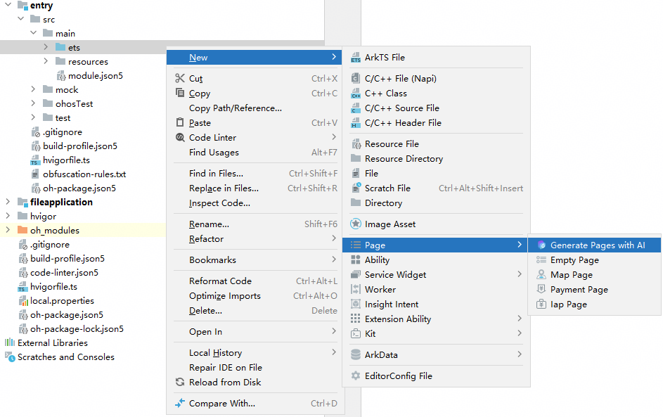 在ArkTS语言的工程中,支持添加Page。Page是表示应用/元服务的一个页面。应用/元服务可以设计为多个功能页面,每个页面进行单独的文件管理,并通过路由API实现页面的调度管理,以实现应用内功能的解耦。ArkTS语言的工程添加Page后,会在pages文件夹下生成一个新的ets文件。