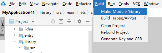 开发完HAR模块后,选中模块名,然后通过DevEco Studio菜单栏的****Build > Make Module ${libraryName}****进行编译构建,生成HAR。HAR可供工程其他模块引用,或将HAR上传至ohpm仓库,供其他开发者下载使用。若部分源码文件不需要打包至HAR中,可通过创建.ohpmignore文件,配置打包时要忽略的文件/文件夹。
