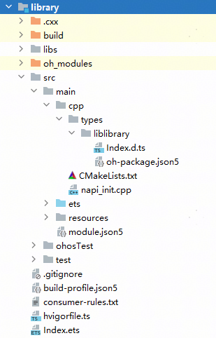 - src > main > cpp > types > liblibrary > oh-package.json5:描述so三方包声明文件入口和so包名信息。