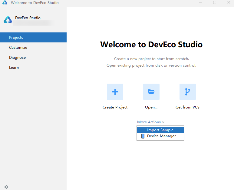 在DevEco Studio的欢迎页,在Projects页签下,单击M********ore Action > Import Sample按钮,导入Sample工程。