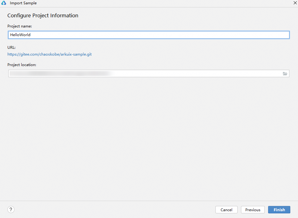设置Project name和Project location,然后单击Finish,等待Sample工程导入完成。