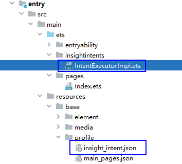 点击Finish,完成意图框架创建。此时将在entry > src > main > ets > insightintents目录下生成入口代码文件;在entry > src > main > resource > base > profile中,生成i********nsight_intent.json文件,可在该文件查看当前意图框架配置的相关信息。