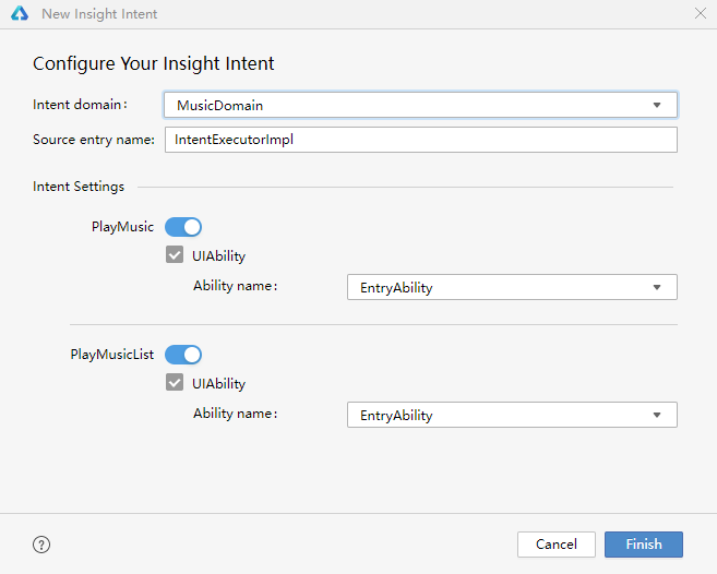 - PlayMusic:开启/关闭PlayMusic意图能力,实现播放歌曲(指定一首)。默认需要关联UIAbility,可在Ability name中下拉框选择需要关联的Ability能力。