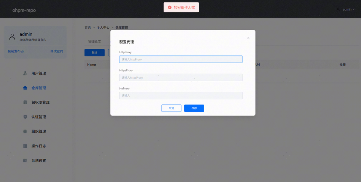 现象:打开ohpm-repo私仓管理界面,访问仓库管理页面中uplink代理配置页面,或访问认证管理页面中证书认证配置页面,报错“加密组件无效”,且已经配置的信息被清空。