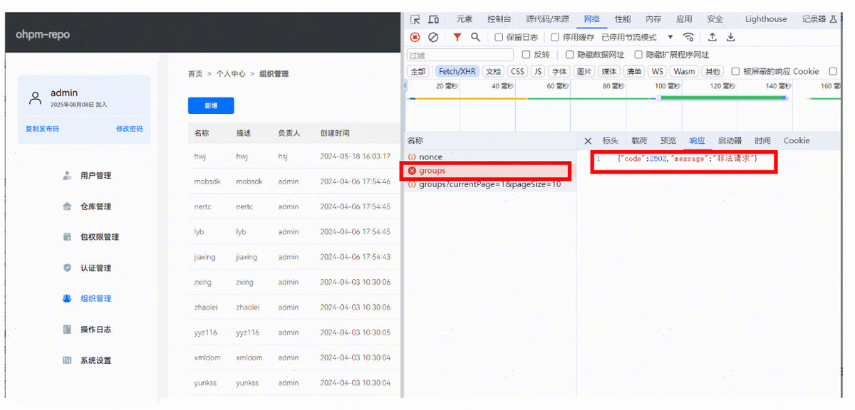 现象:访问ohpm-repo私仓管理界面的页面功能,报错“非法请求”。