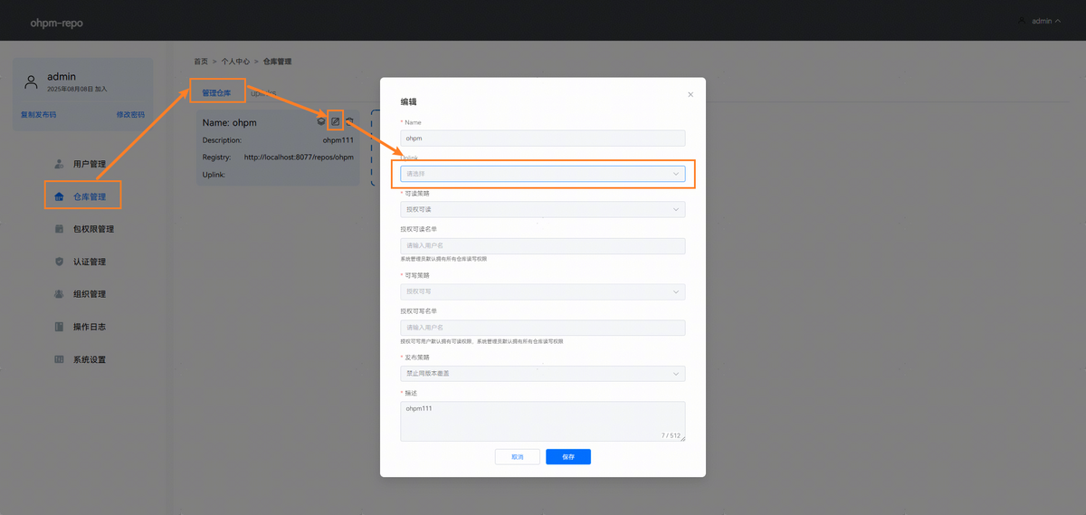 - 仓库管理:编辑仓库,管理三方包(可以通过ohpm-repo管理界面直接发包),编辑uplink仓库和配置代理信息。