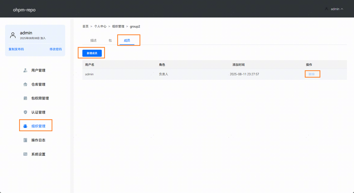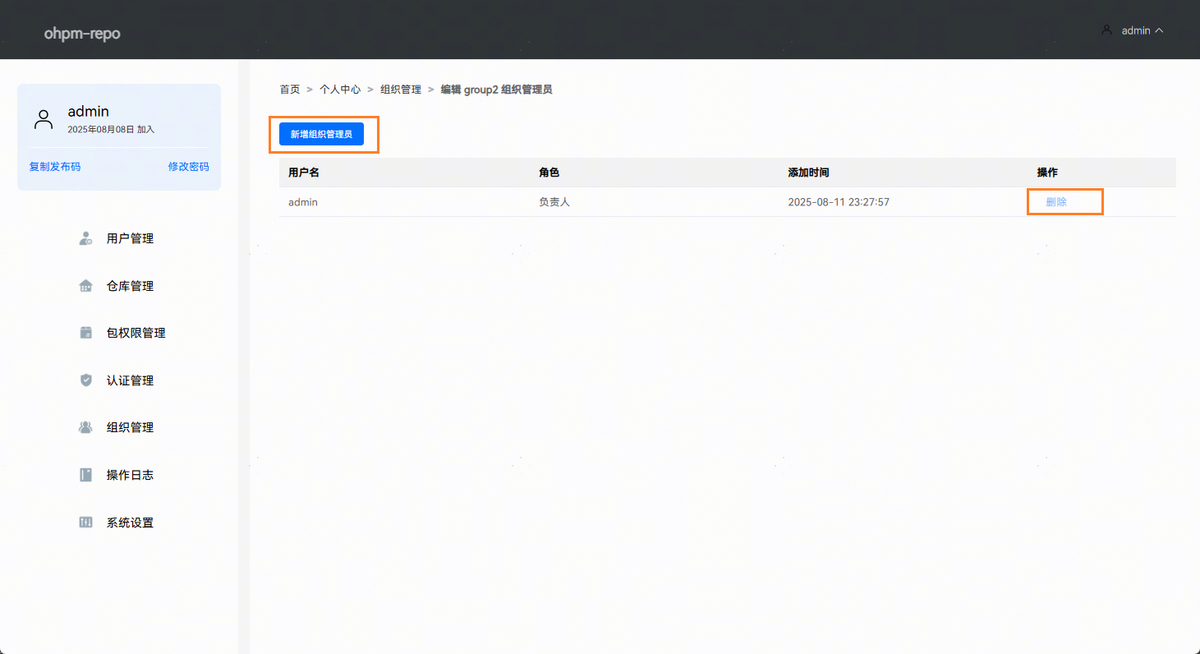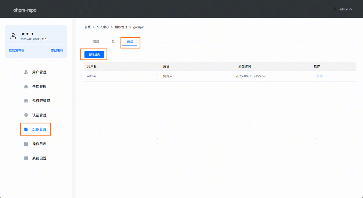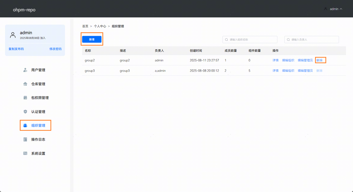 - 通过ohpm-repo管理界面中仓库管理上传和下架包:只有系统管理员才有此权限。有组织包管理:系统管理员可对所在组织的全部包执行上架与下架操作;无组织包管理:系统管理员可上架所有无组织包(注:无组织包的所有版本仅限单一用户上传),并拥有下架全部无组织包的权限。