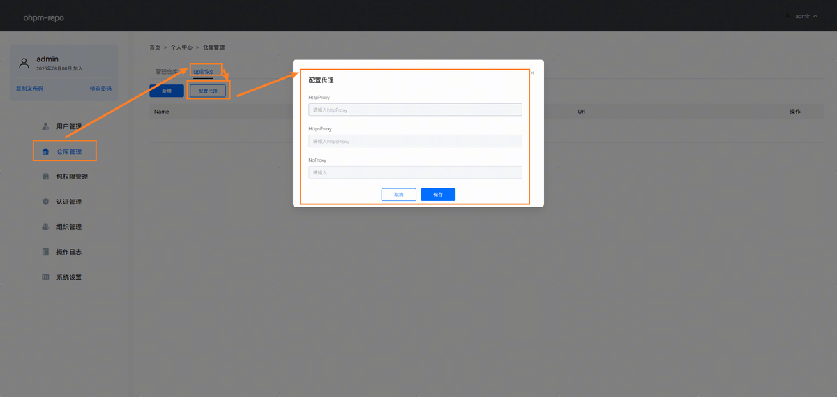 - 在ohpm-repo管理界面的仓库管理处,重新配置uplink的代理信息。