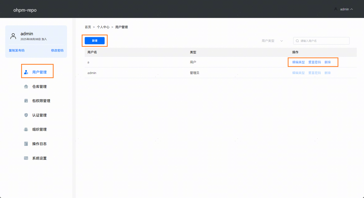 登录任一管理员账户,能够在ohpm-repo的用户管理界面新增用户并管理其他用户(删除用户,变更用户类型,重置密码):
