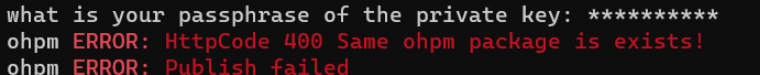 现象:ohpm执行publish命令,命令行报错信息为:Same ohpm package is exists!