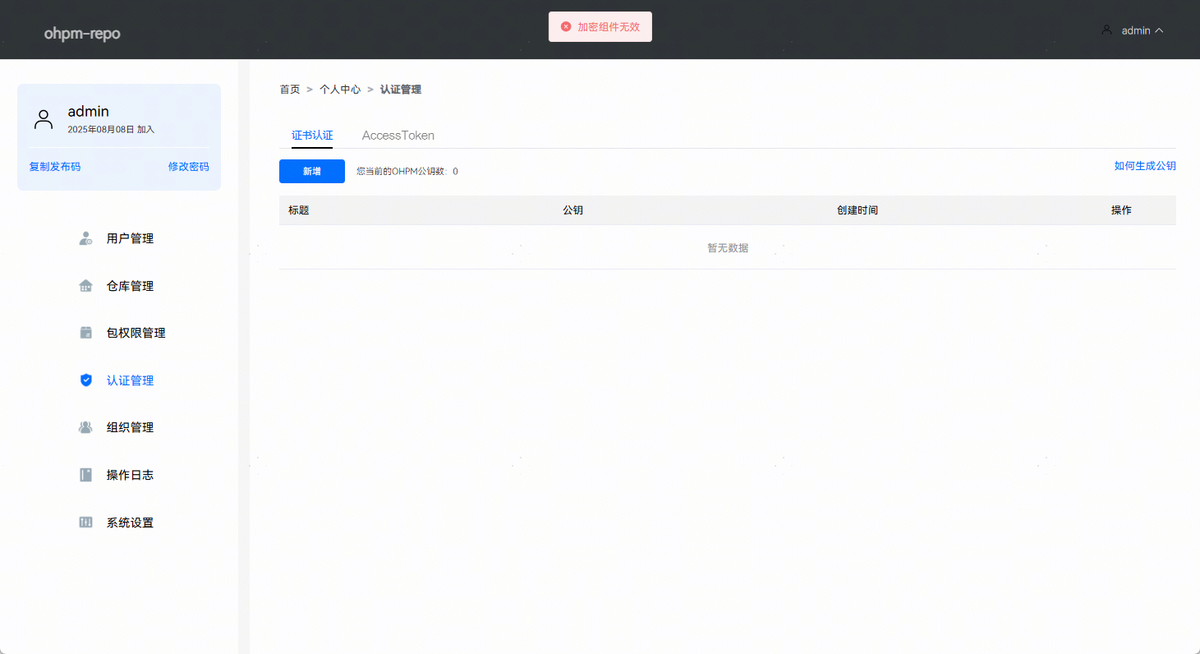 访问ohpm-repo私仓管理页面,报错“加密组件无效”。