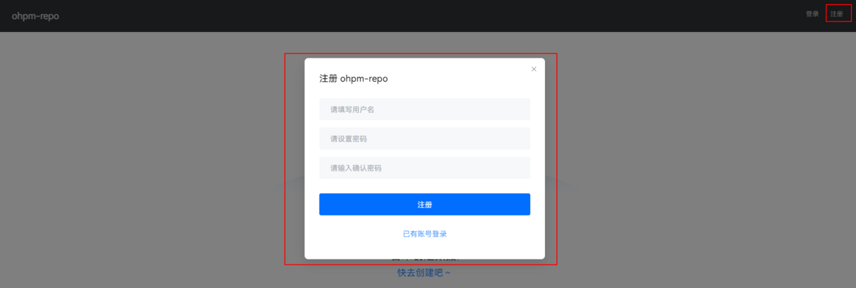 通过ohpm-repo管理界面的注册按钮新增用户类型: