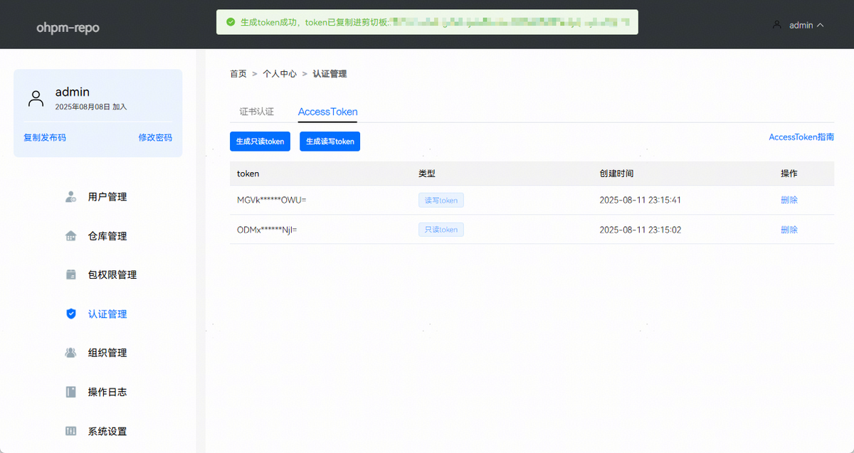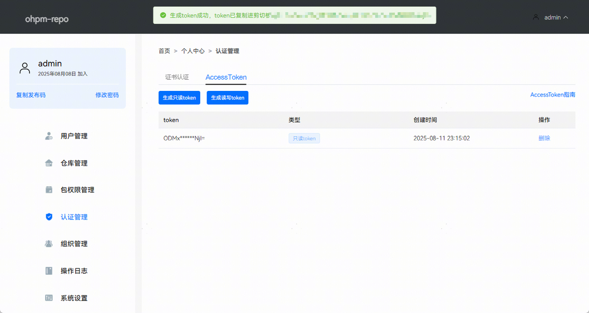 点击生成读写Token,ohpm-repo将自动生成一个专用于ohpm客户端进行包信息查询(info)、安装包(install)、发布包(publish)、下架包(unpublish)和版本标记(dist-tags)操作的认证Token。页面效果如下图所示: