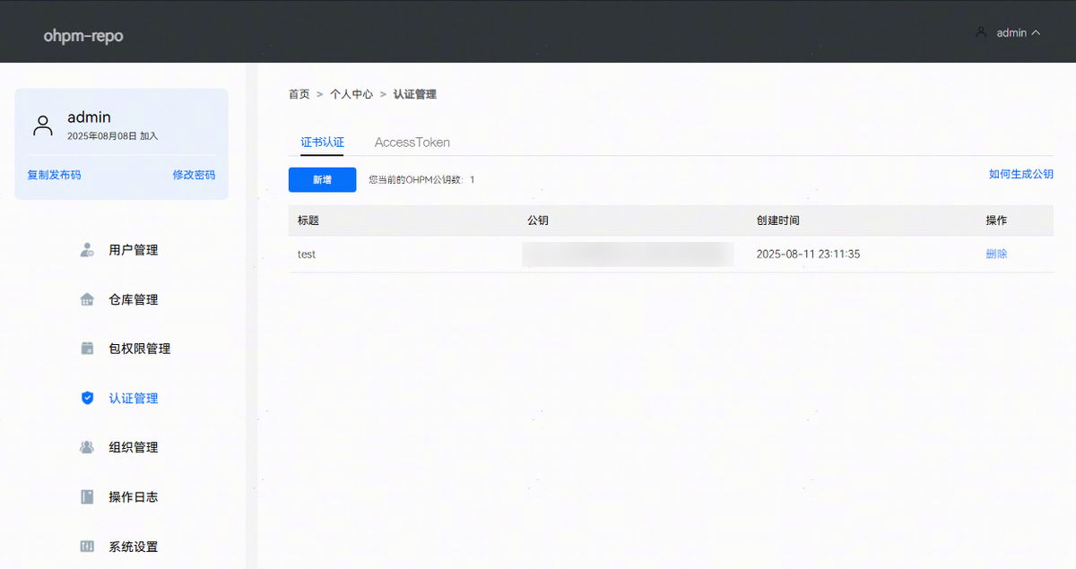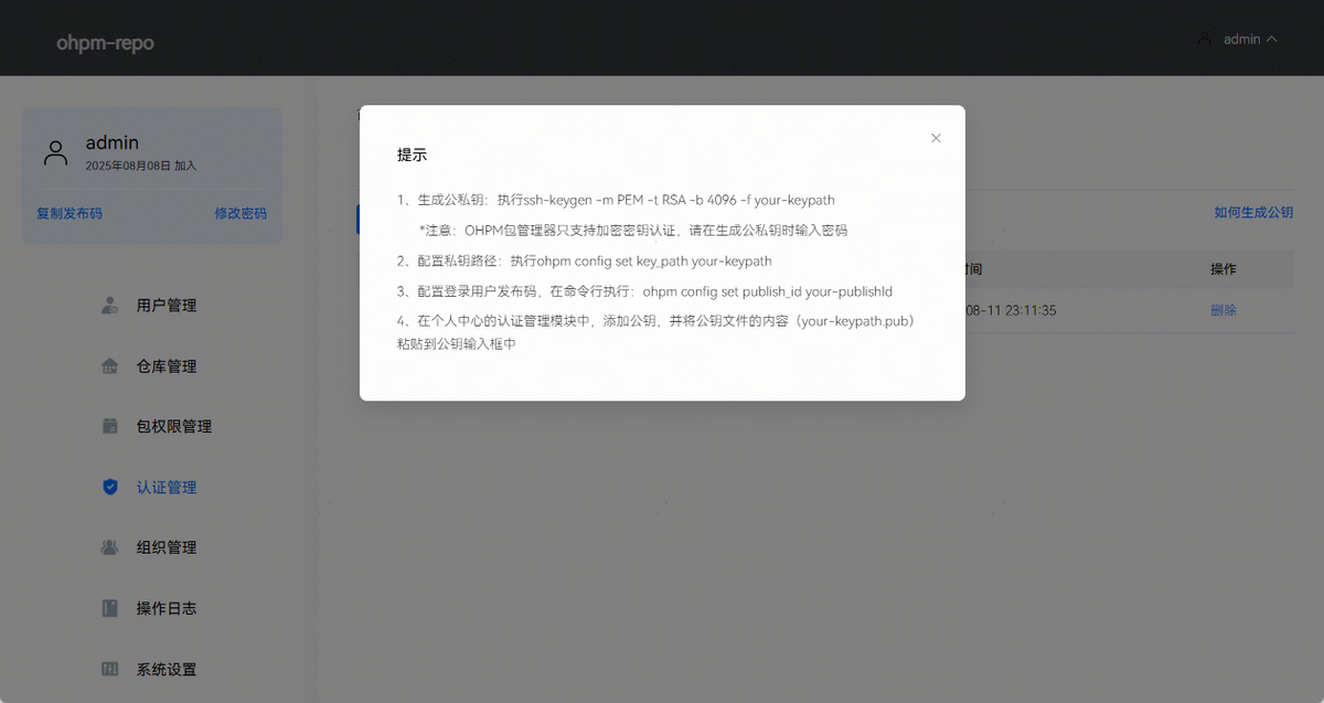 使用ohpm发布包时,需要先在配置文件.ohpmrc文件中配置publish_id和key_path。publish_id对应发布码,key_path对应私钥的地址,其详细发布流程见使用命令行工具发布。认证管理主要是管理私钥对应的公钥信息,在用户使用ohpm发布包时进行校验。认证管理页面效果如下图所示: