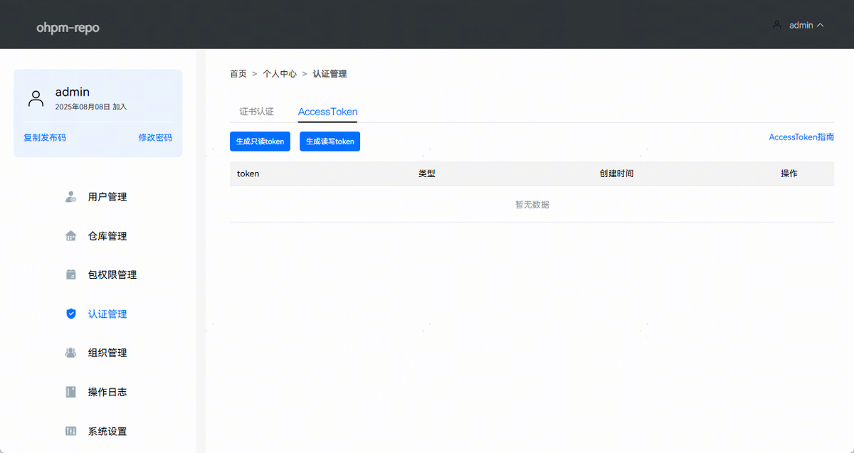 AccessToken是ohpm-repo 2.1.0版本新引入的认证机制(需配套使用1.6.0及以上版本的ohpm命令行工具),用户通过ohpm-repo界面生成Token,并将其配置至ohpm客户端配置文件中。在与ohpm-repo交互时,客户端会自动附带Token进行身份验证。