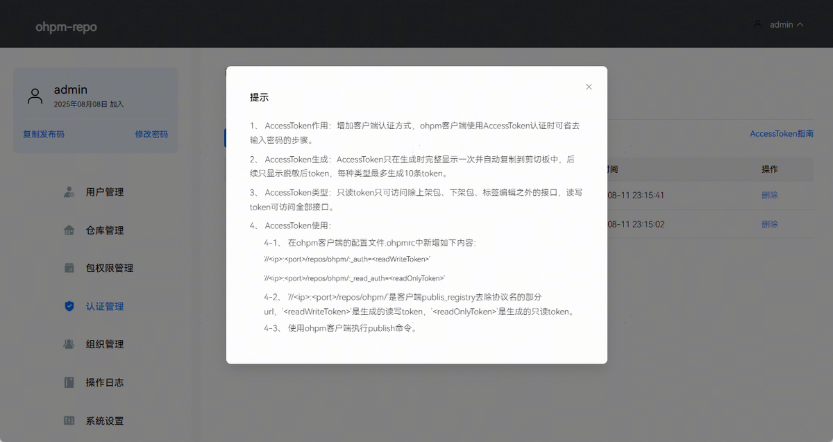 AccessToken认证:将ohpm-repo生成的AccessToken配置到ohpm客户端配置文件中,实现publish、unpublish、dist-tags、info和install等操作的免密认证。
