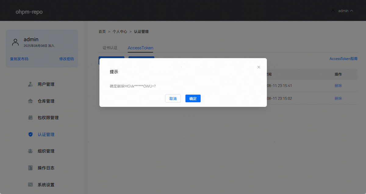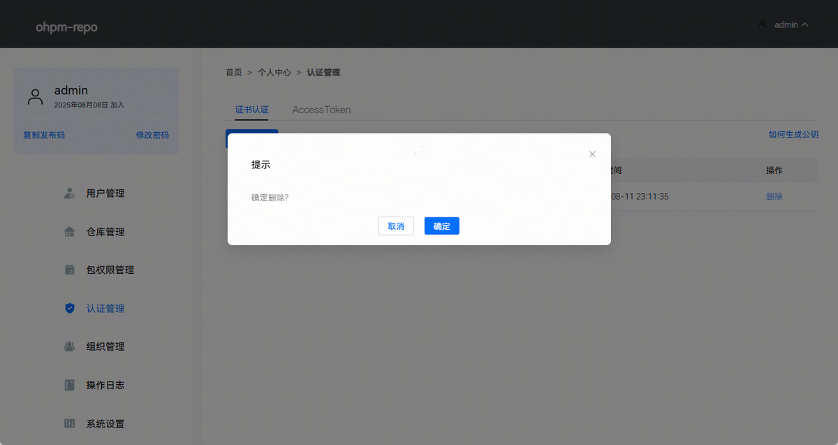 当前ohpm-repo的认证方式有证书认证和AccessToken两种方式: